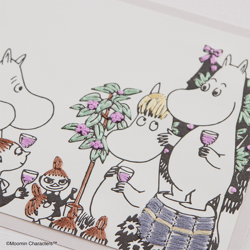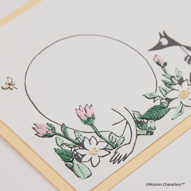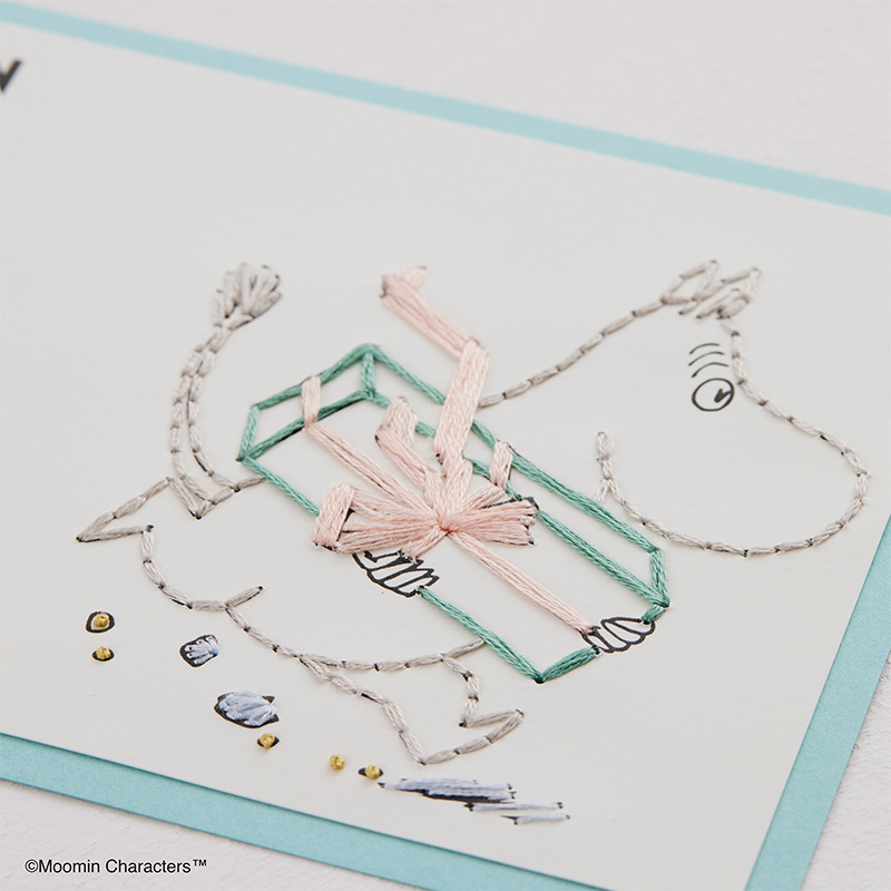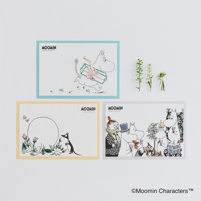 ムーミントロールのいろいろな表情がかわいい!「ムーミン」のポストカードをぬり絵をするようにたのしむ、紙刺しゅうキットができました。5つの基本的なステッチで刺しゅうしていきます。