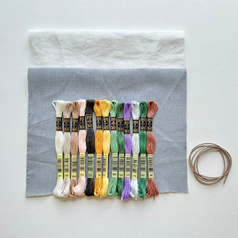 リネン生地(オフホワイト、ブルーミスト)、DMC25番刺繍糸(13色)、ワックスコード、作り方説明書