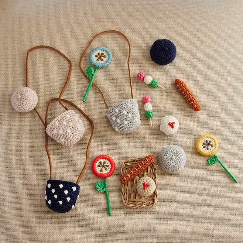 グレーのベレー帽(幅3cm×深さ2cm)、水玉ポシェット(幅4cm×深さ3.5cm)、黄色の花(横2.5cm×縦6.5cm)、3色だんご2本(横1cm×縦3.5cm)、トレー(横5.5cm×縦4cm)
