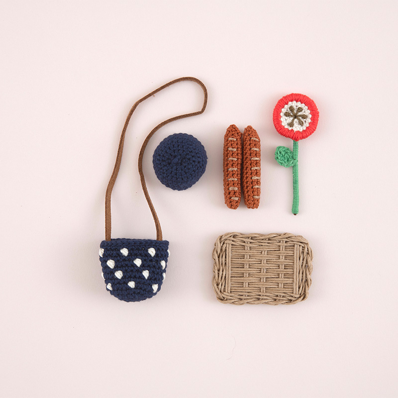 紺色のベレー帽(幅3cm×深さ2cm)、水玉ポシェット(幅4cm×深さ3.5cm)、赤色の花(横2.5cm×縦6.5cm)、フランスパン2個(横1cm×縦4.5cm)、トレー(横5.5cm×縦4cm)