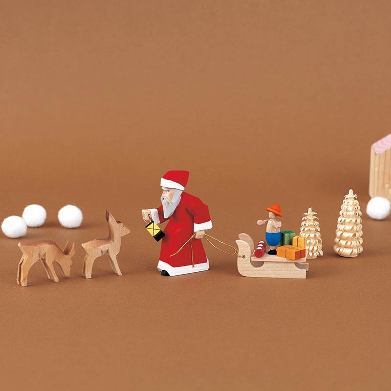 【限定40】【完成品】手作業で彫り上げペイントされた、木の温もりが味わい深いクリスマス飾りを、スペシャル感のあるリボンつき木箱に入れてお届けします。シーズンの後は大切にしまって、また来年も…。