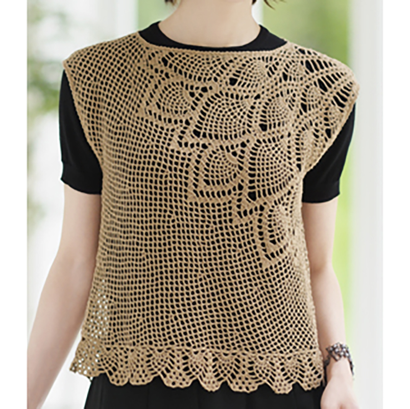 肩を覆うような大きなパイナップル模様をデザインしたベスト。後ろも前と同様の模様が入っています。裾にあしらったパイナップルもポイント。