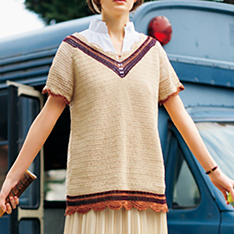 衿ぐりと裾のラインが目をひくVネックの半袖プルオーバー。身頃は長編み、袖は方眼編みになっています。