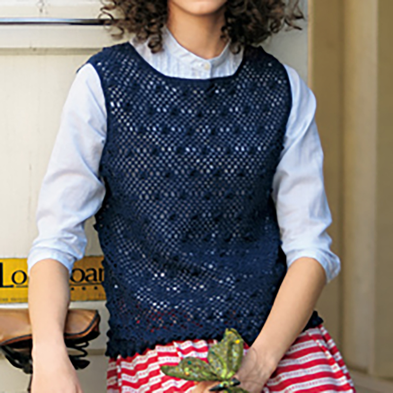 ネット編みはもっと簡単。ところどころに入るポコポコをアクセントにして、鎖編みと細編みでどんどん編んでいけるはず。清楚で可憐なイメージの紺がお似合い。