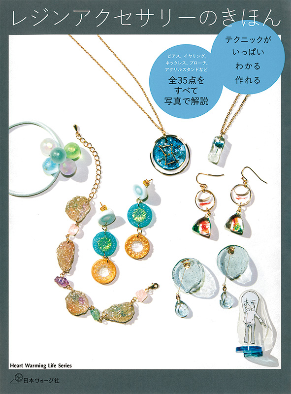 レジンで作るネックレス、ピアス、イヤリング、イヤーカフ、ブレスレットなどきほんから新テクニックのものまで35点。作り方は写真で掲載し、基礎知識つき。推し活でも人気のレジンで作るアクリルスタンドも登場。地球屋、キムラプレミアム、ERMINIA、Favori、くらげ雑貨店の人気5人が登場。