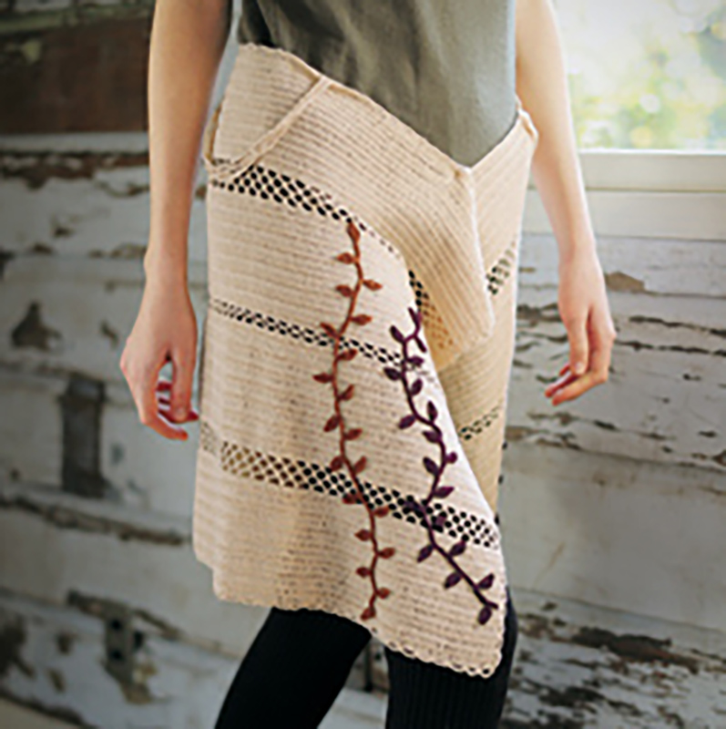 肩ひもをつけたキャミソールをオーバースカートに。長編みも鎖編みもばっちり編めるようになったから、葉っぱのモチーフをプラスしてのせてドレスアップ。私、やるでしょ!