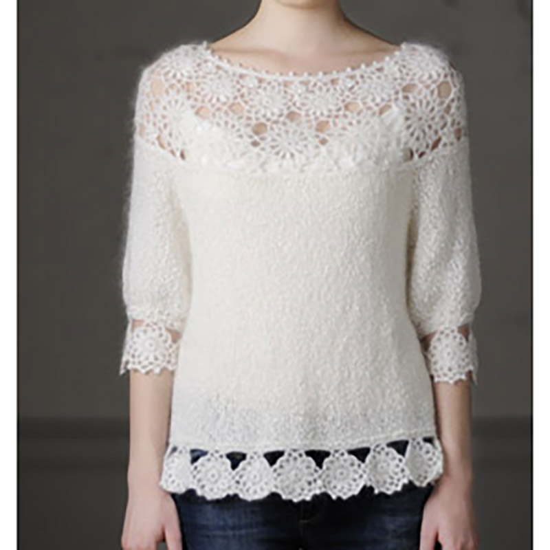 モヘアの柔らかな雰囲気が、淡雪のように美しいプルオーバー。メリヤス編みの土台に、大・中・小のモチーフを配し、モチーフそのものの存在感が際立つデザインになっています。