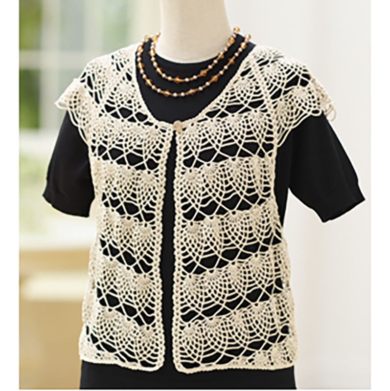 3玉で編めるコンパクトさが魅力のボレロ。ネックから編み下がっていくタイプです。折り重なるようにして並ぶパイナップルが華やかなデザイン。