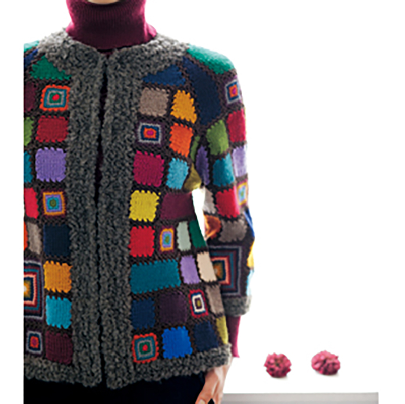 色の豊富なパーセントだからできる、パッチワーク風のジャケット。メリヤス編みのカラーブロックの間にはめ込んだかぎ針あみのモチーフがアクセントに。ペアのアームウォーマーともナイスコンビネーション。