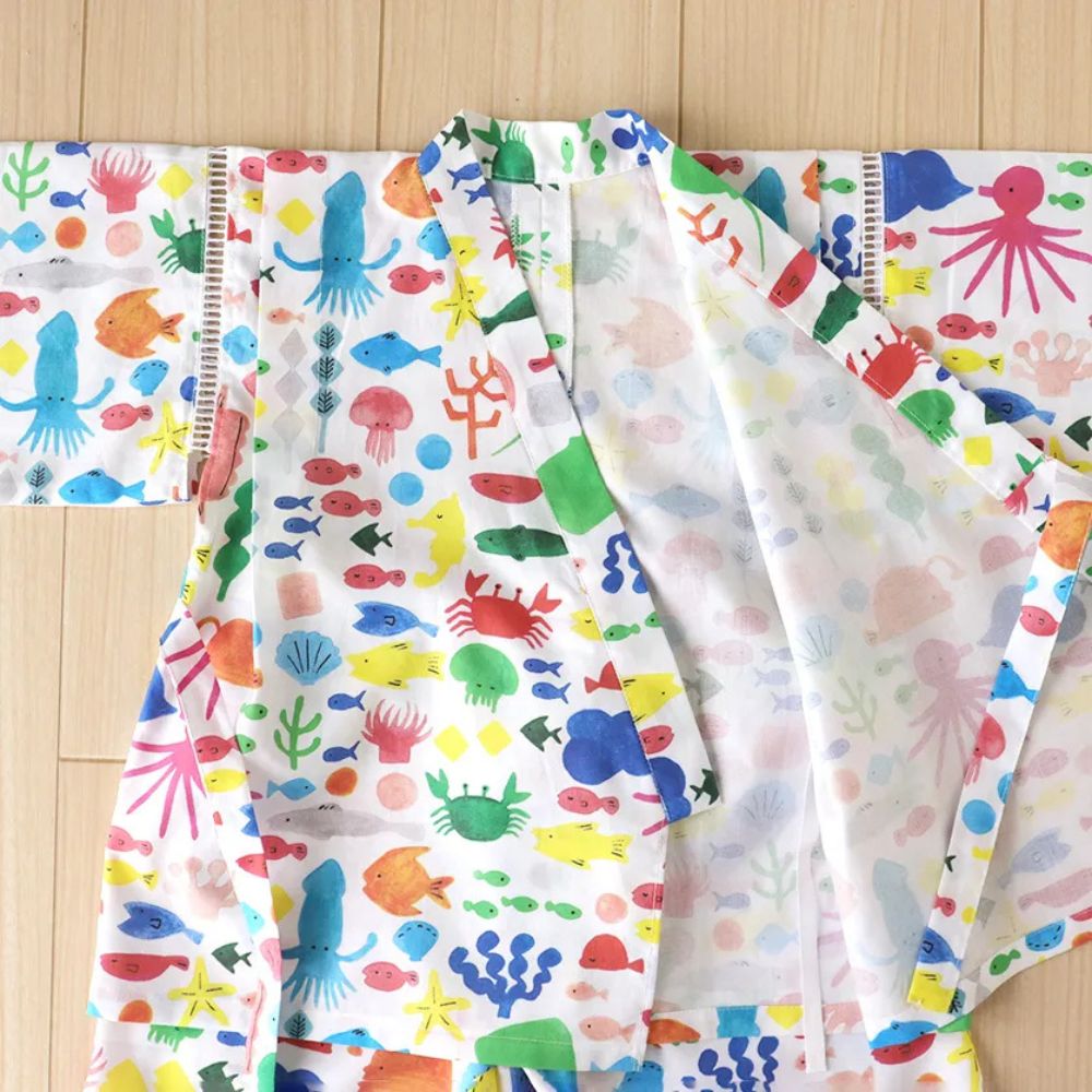 テキスタイル(布)の魅力がいっぱいの可愛いこども甚平は、夏祭りや花火大会に活躍してくれそう!暑い日のパジャマにも便利な甚平。