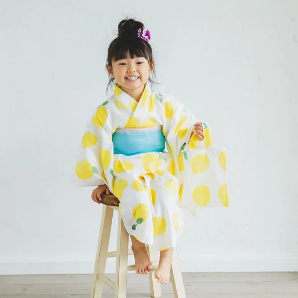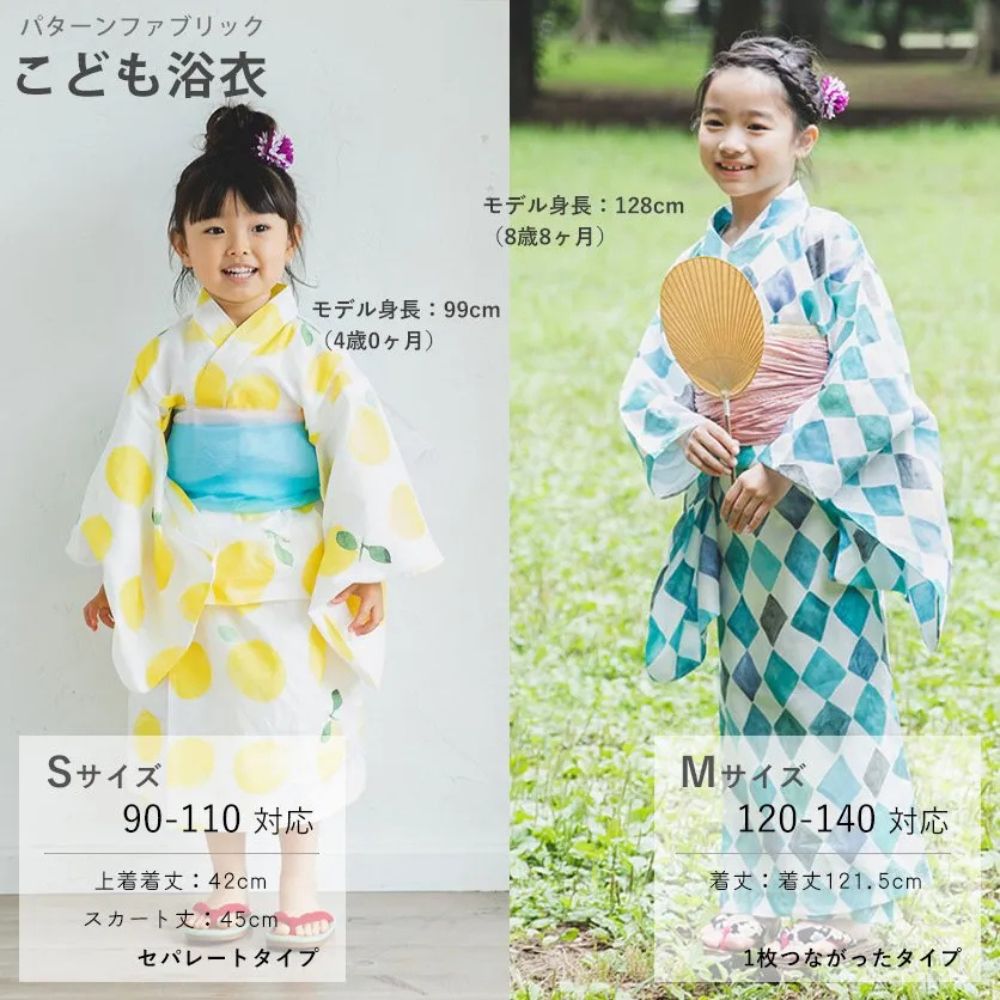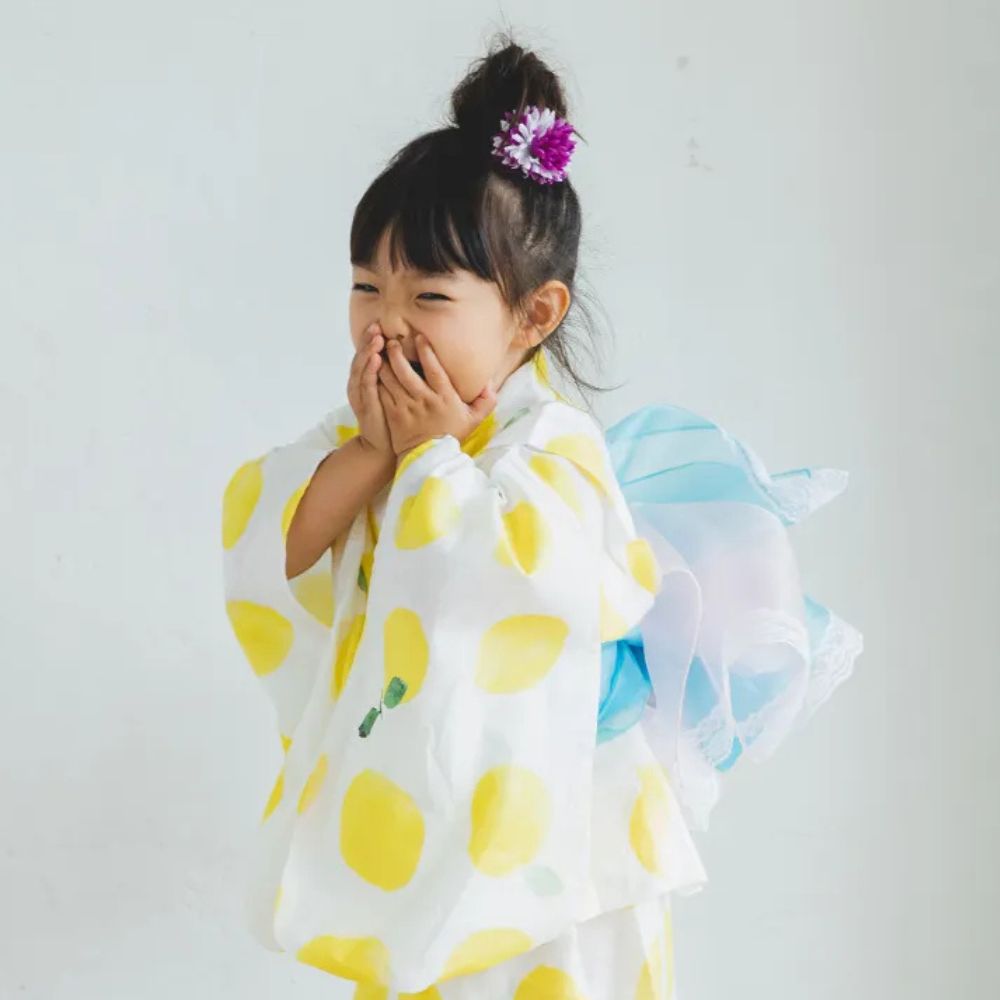 ぱっと目を惹く、涼し気で華やかなこども用浴衣。 おしゃれなテキスタイルで作る、とっておきの可愛い一着になってくれますように。