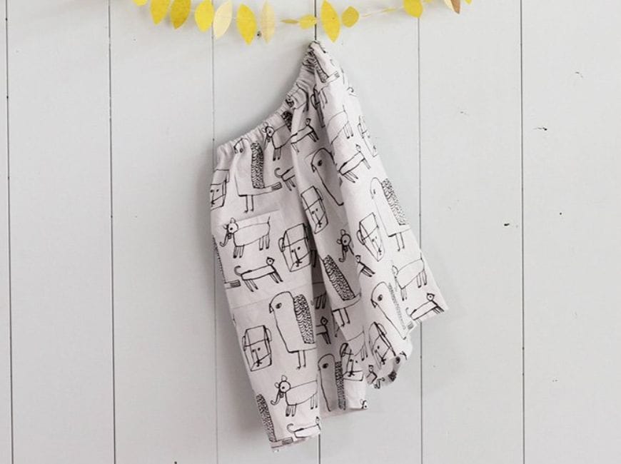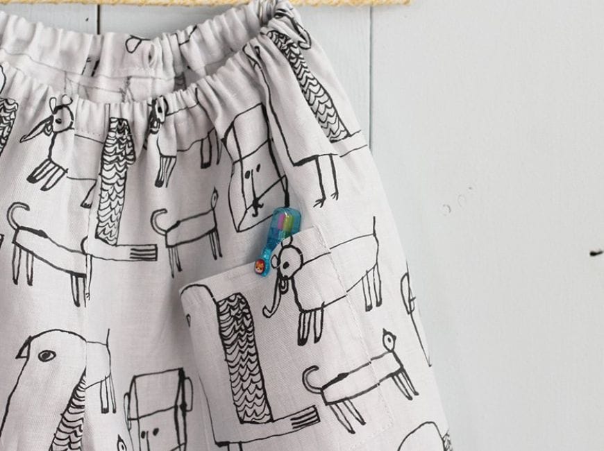 型紙がそのまま布にプリントされた「パターンファブリック」の、こども用パンツです。型紙を用意する手間がいりませんので、切って縫ってすぐに着ることができます。