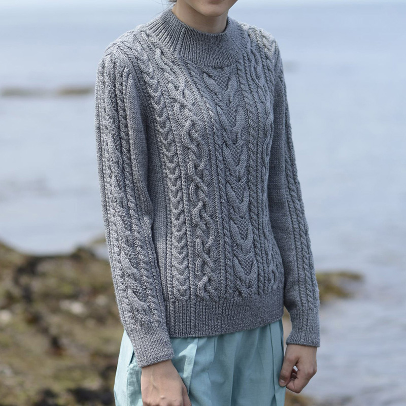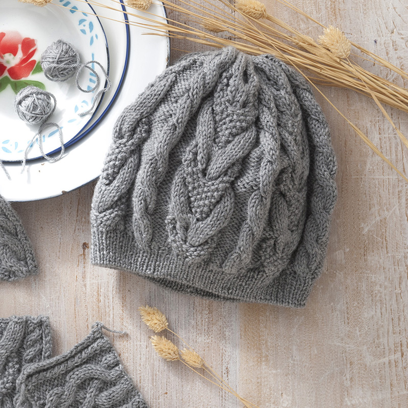 交差から生まれる柔らかな表情のケーブル模様のラウンドネックのプルオーバーとベレー帽のセット。ベレー帽はバルキーケーブル使いで、より立体感を表して。定番のストレートタイプの糸で風合いよく編み上げました。