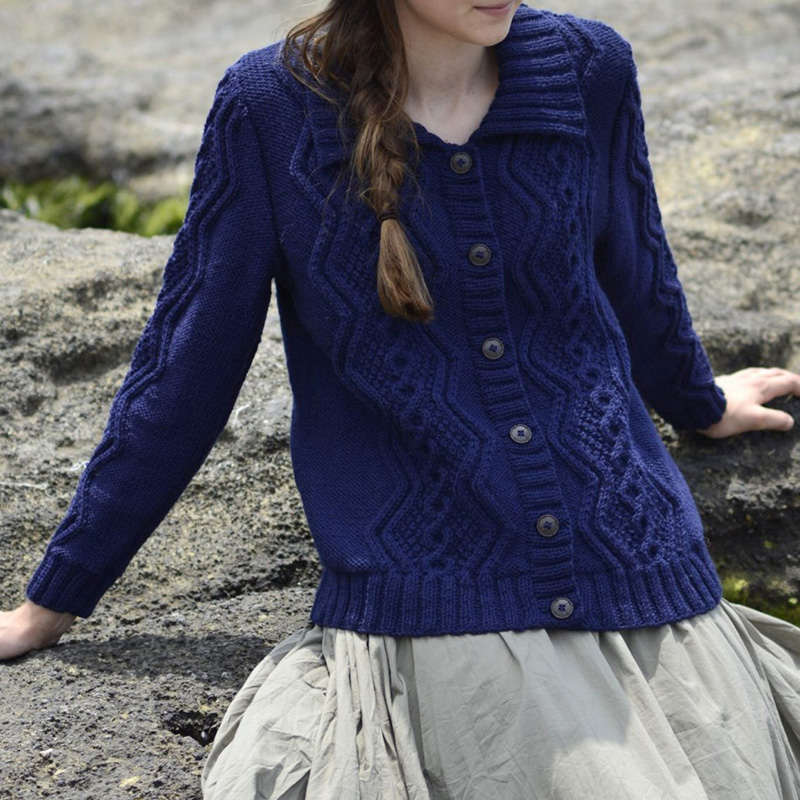アラン諸島の深い海を思わせる、ネイビーカラーで編み上げた衿つきカーディガンとベレー帽の一揃い。裏メリヤス編みを入れることで、大きい模様がひと際映えて。ベレー帽には中心のスプーンのケーブル模様だけを入れました。
