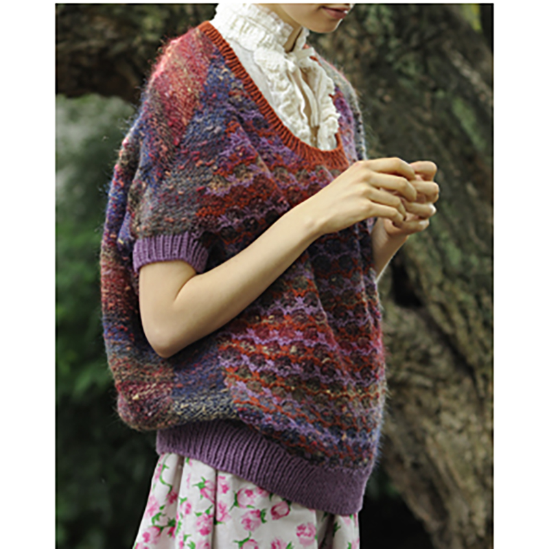前身頃の交差模様は、カラフルなネップヤーンとストレートヤーンを縞に編み、ストレートヤーンを引き上げたタック編みになっています。