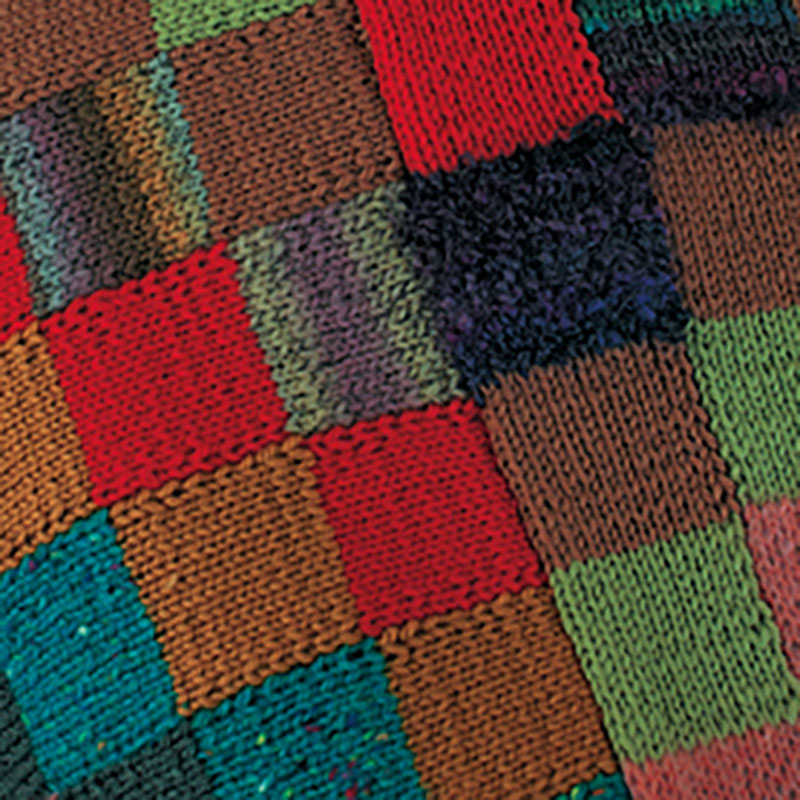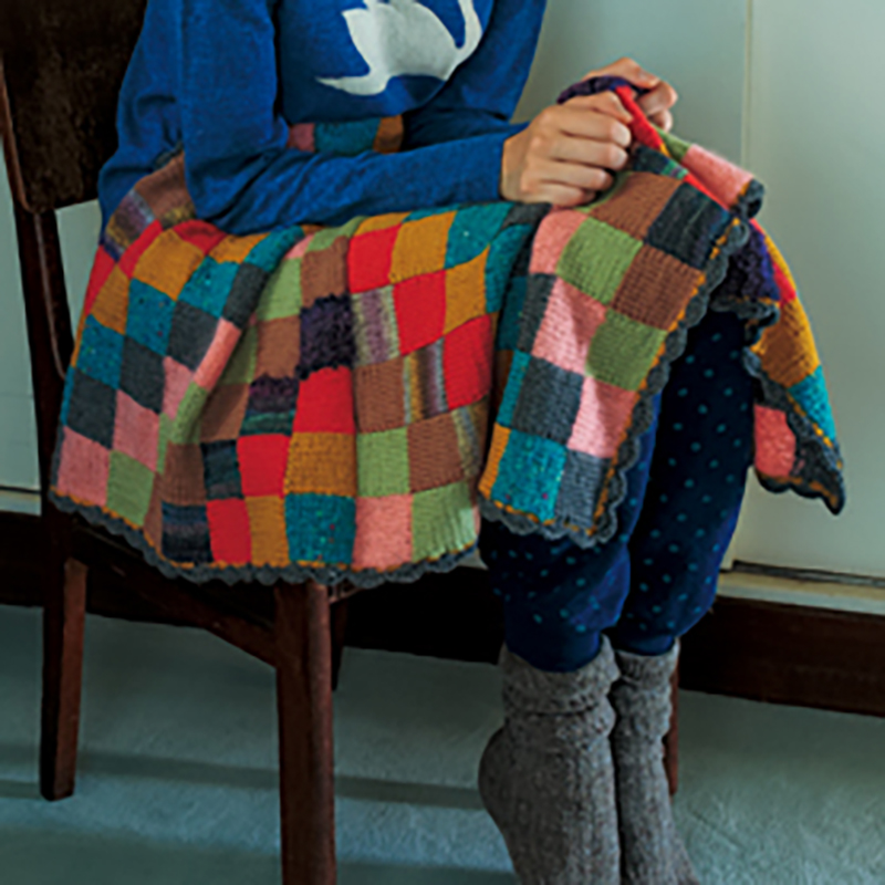 編んで使って楽しくなる、多色使いのパッチワーク風ミニブランケット。四角いピースごとに、縦に糸を渡す方法で編み、最終的に4枚の正方形を中心でつなぎます。縁はかぎ針編みに。