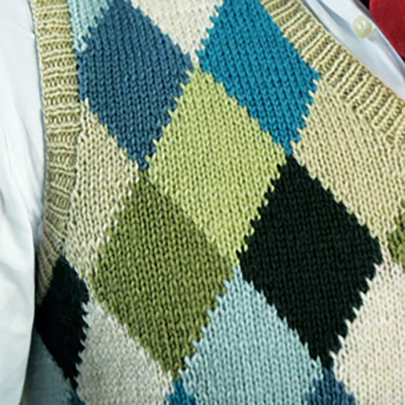 規則正しく並ぶ、アーガイルチェック。モスグリーンや緑味のブルーなど、きれいな寒色系です。ベージュ、深緑、青がアクセントになり、柔らかい配色にリズムが出ました。