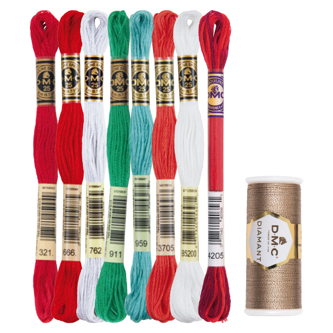 ステッチイデーvol.40 41ページ掲載の作品に使用しているDMC25番糸刺しゅう糸と美しい輝きのディアマントのセットです。上品なクリスマスカラーが気分を盛り上げてくれそう。