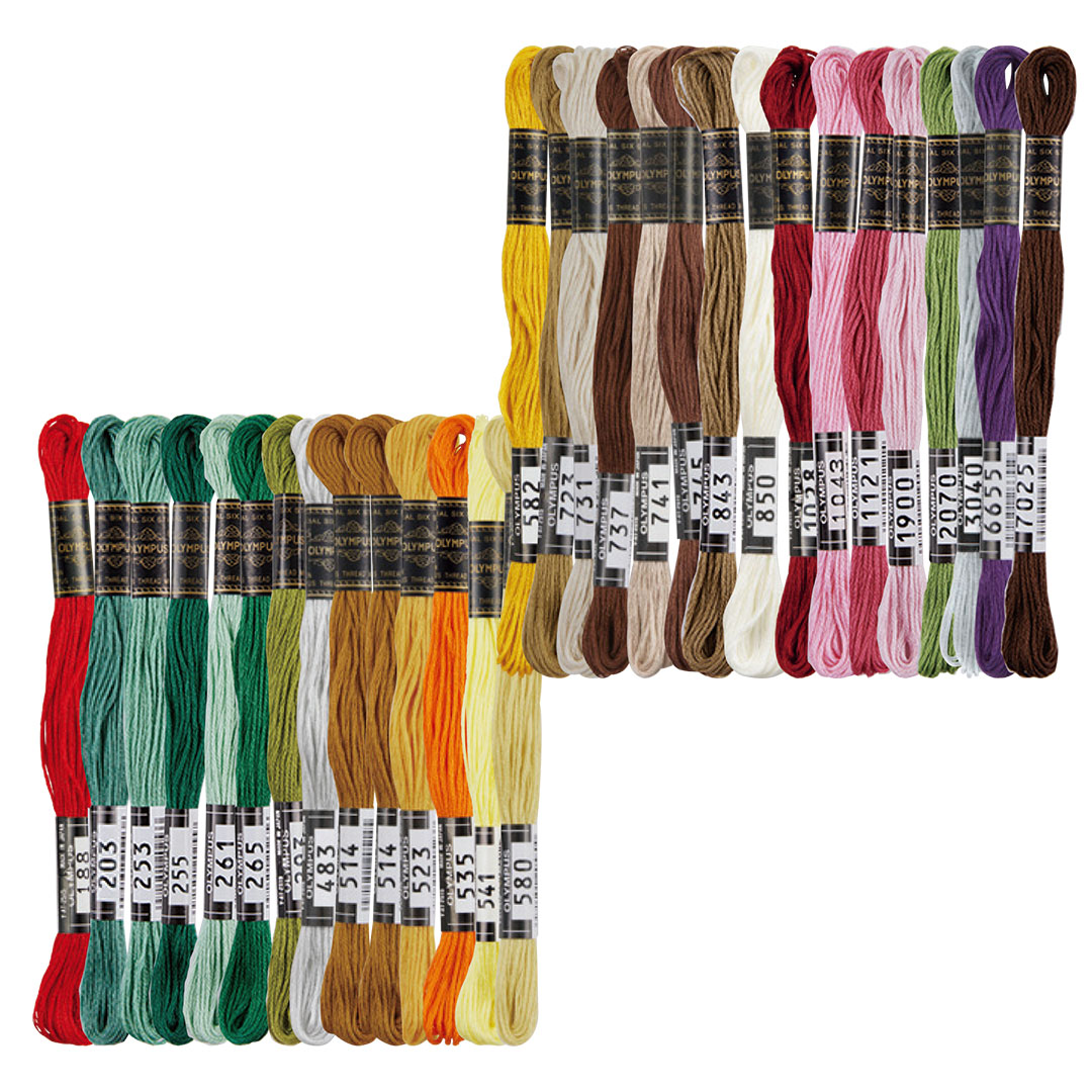 ステッチイデーvol.40 12ページに掲載の作品に使用した、オリムパス25番刺しゅう糸のセットです。刺しゅうが楽しくなるカラフルな色使いです。