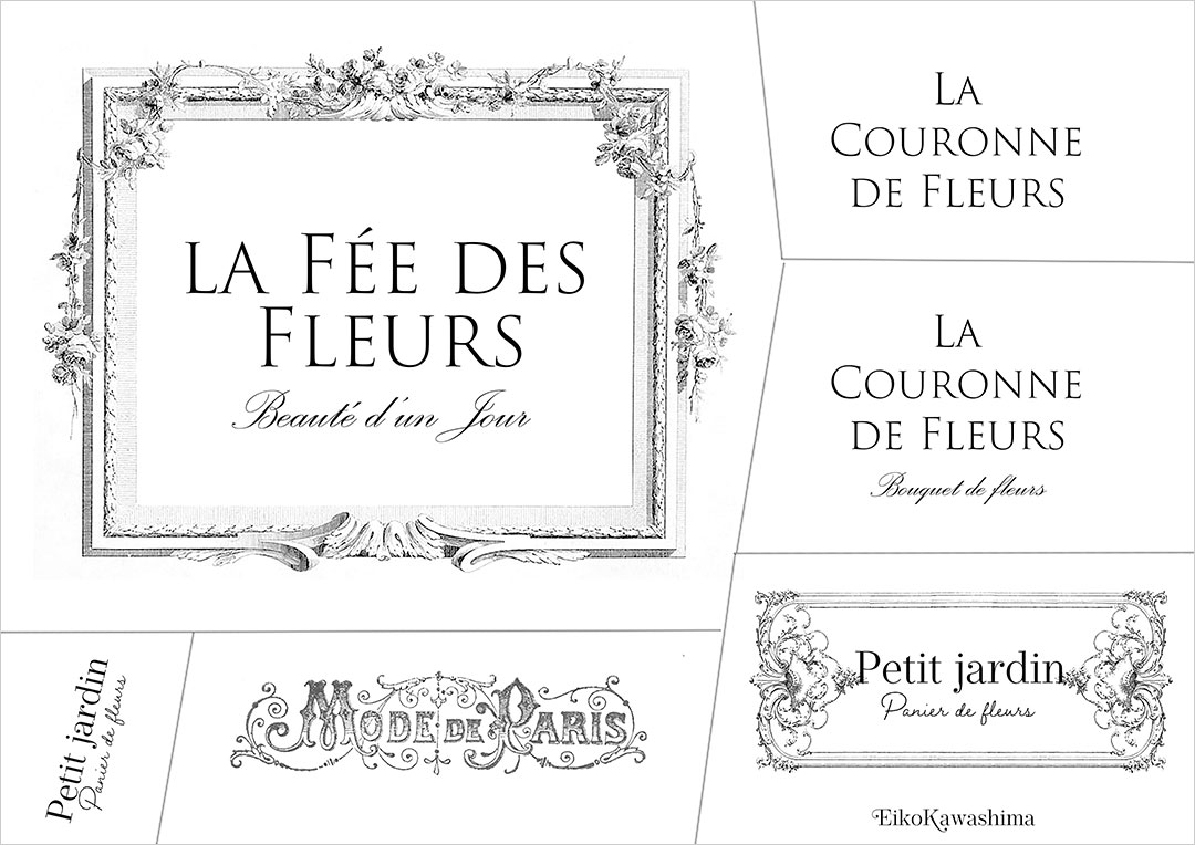 「LA FEE DES FLEURS(花の妖精) 」、「LA COURONNE DE FLEURS(花の冠)」などの文字とアンティークなフレームの組み合わせ6種が入っています。