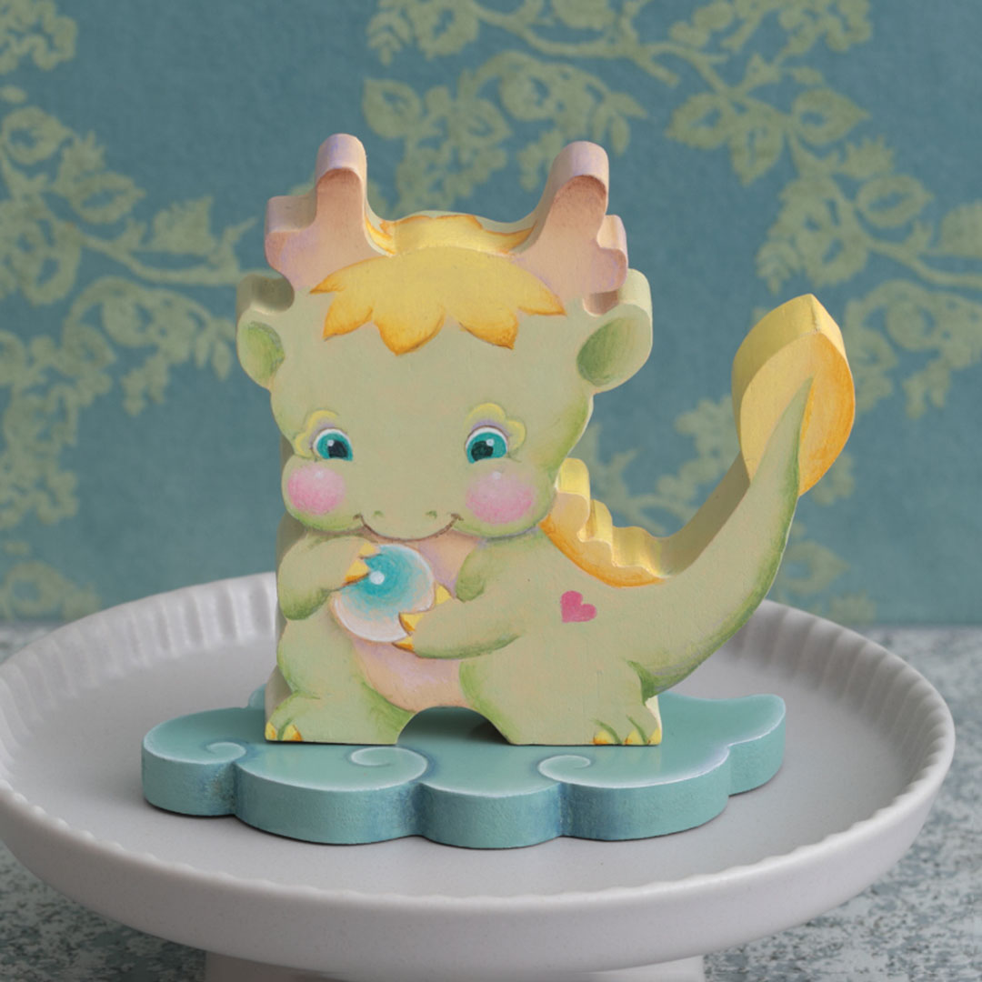 雲の台座や長い尾が、将来の立派な成長を予感させるカットアウトです。豪壮・勇猛に描かれることの多い龍を、赤ちゃん時代のかわいらしい姿で描きます。