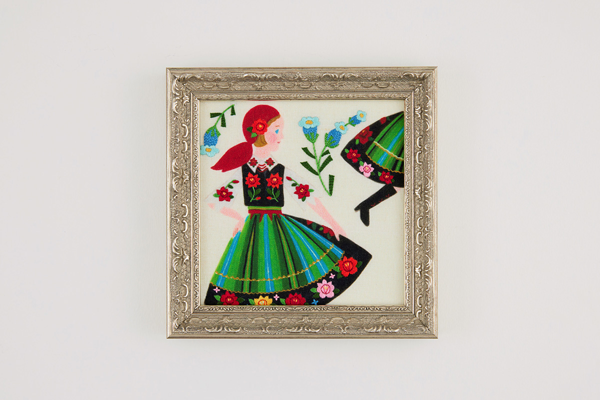 シリーズ第四弾は祭礼や民族舞踏の際に身に付けられてきたポーランドの民族衣装。ポーランド中央に位置するウォヴィチの民族衣装は、緑を基調とした大胆な縦縞のスカートが特徴です。黒地に鮮やかな花の刺繍が施され、とっても華やか。モダンな雰囲気もあるポーランドの刺繍フレームをぜひお部屋に飾ってみてください。