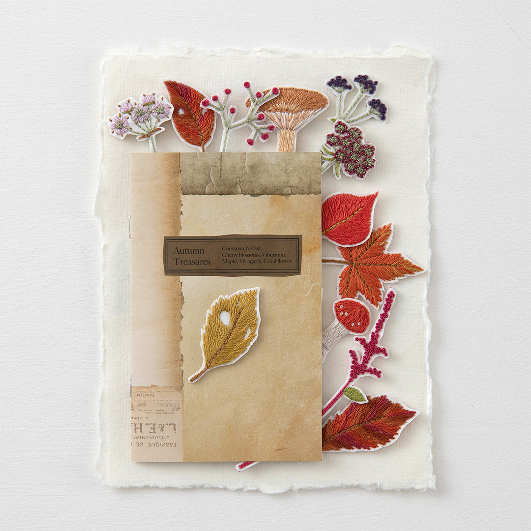 12種類の秋の草花を刺しゅうして、オリジナルノートに挟んで飾ります。