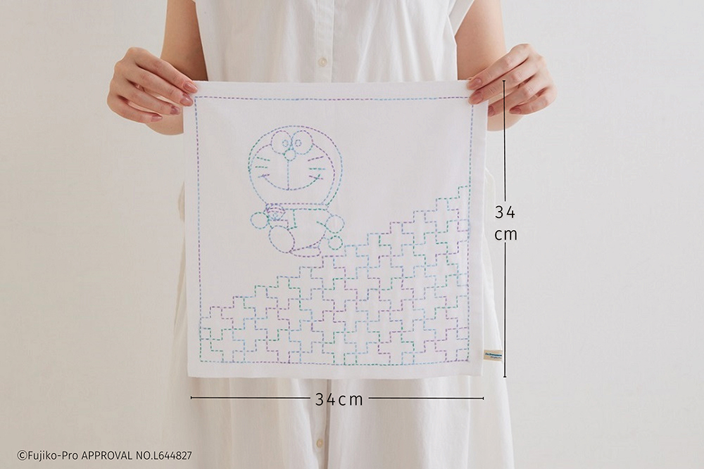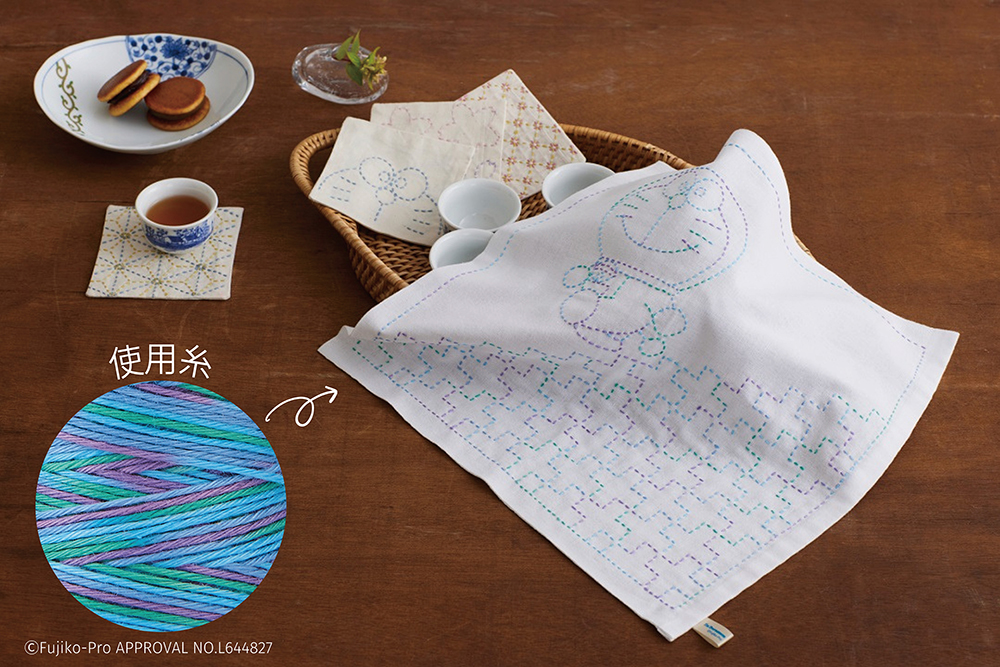 刺し子布には、水で消えるインクで図案が印刷されています。面倒な図案写しが不要で、しかも正確に刺せるので、初心者さんでも手間なくかわいく仕上がります。