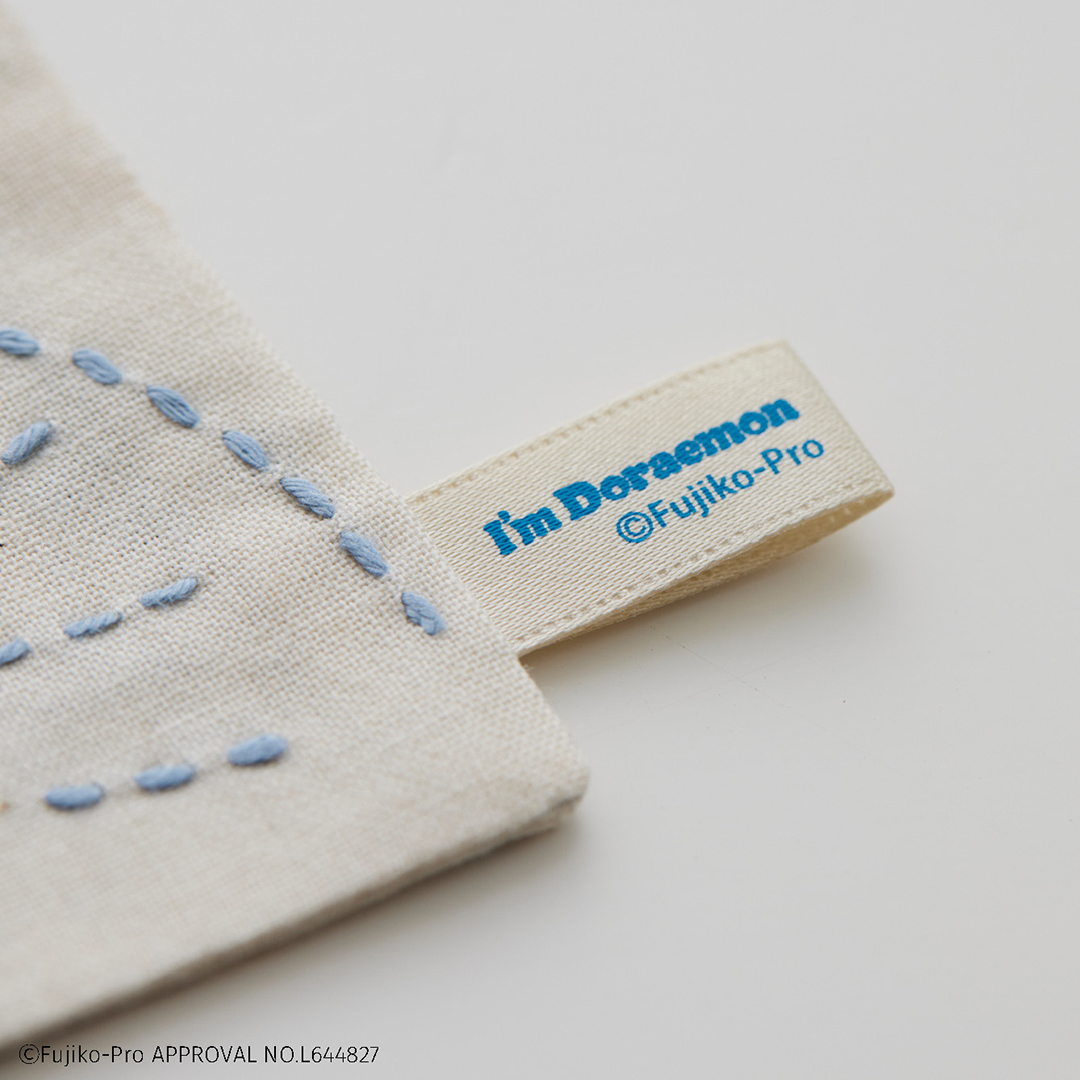 タグには「I’m Doraemon」のロゴと、ドラえもんらしい鈴のイラストをあしらっています。二つ折りにして縫い込めば、飾りとしてもフックにかける際のループとしても使えます。