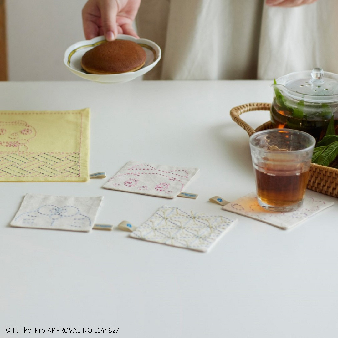 作品は約10×10cmのコースターに仕立てます。(※洗濯前のサイズ。水につけると1割程度縮みます。) 小ぶりで何枚も集めたくなります。