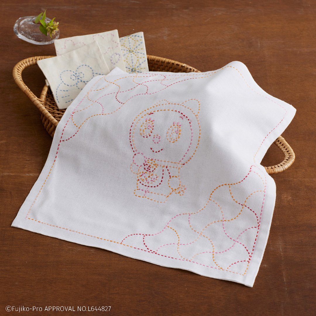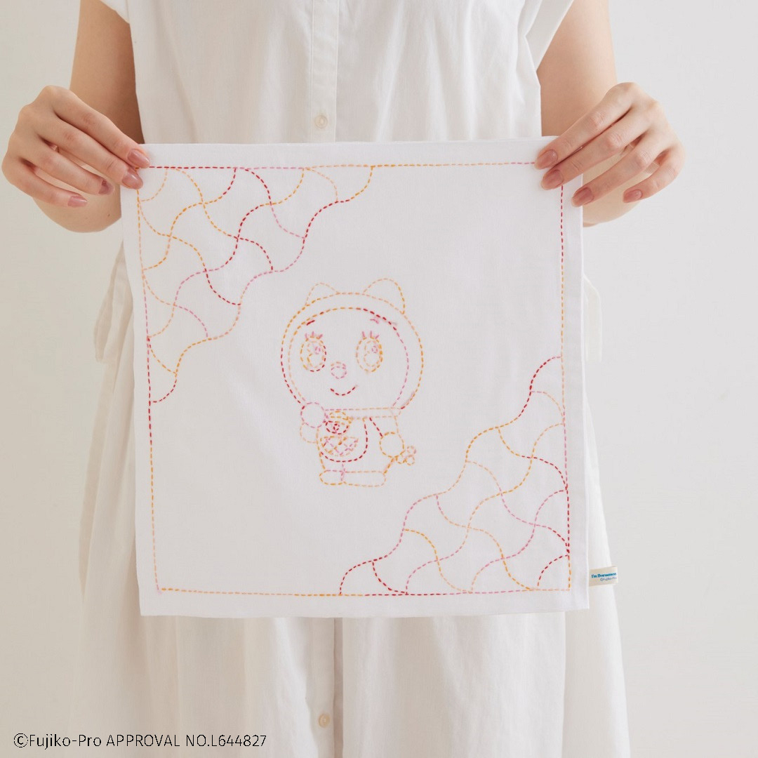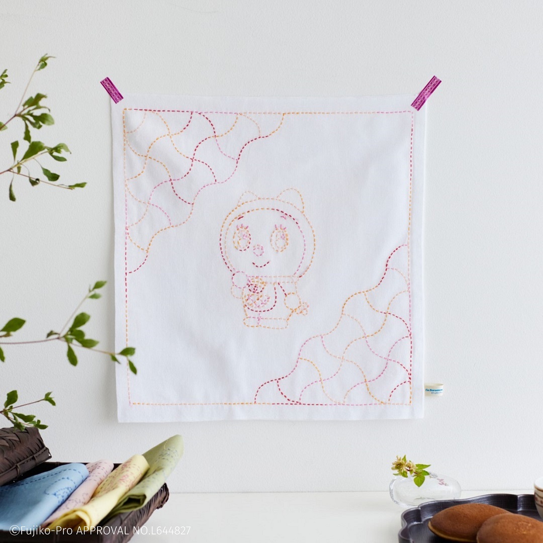 ドラミちゃんと日本の伝統柄「分銅つなぎ」が楽しめる刺し子キットです。金や銀を天秤で重さを量るための重り「分銅」の形にして貯蓄されていたことから、「富の象徴」という意味があり縁起がよい文様とされています。かわいくたたずむドラミちゃんと組み合わせてふきんにしました。