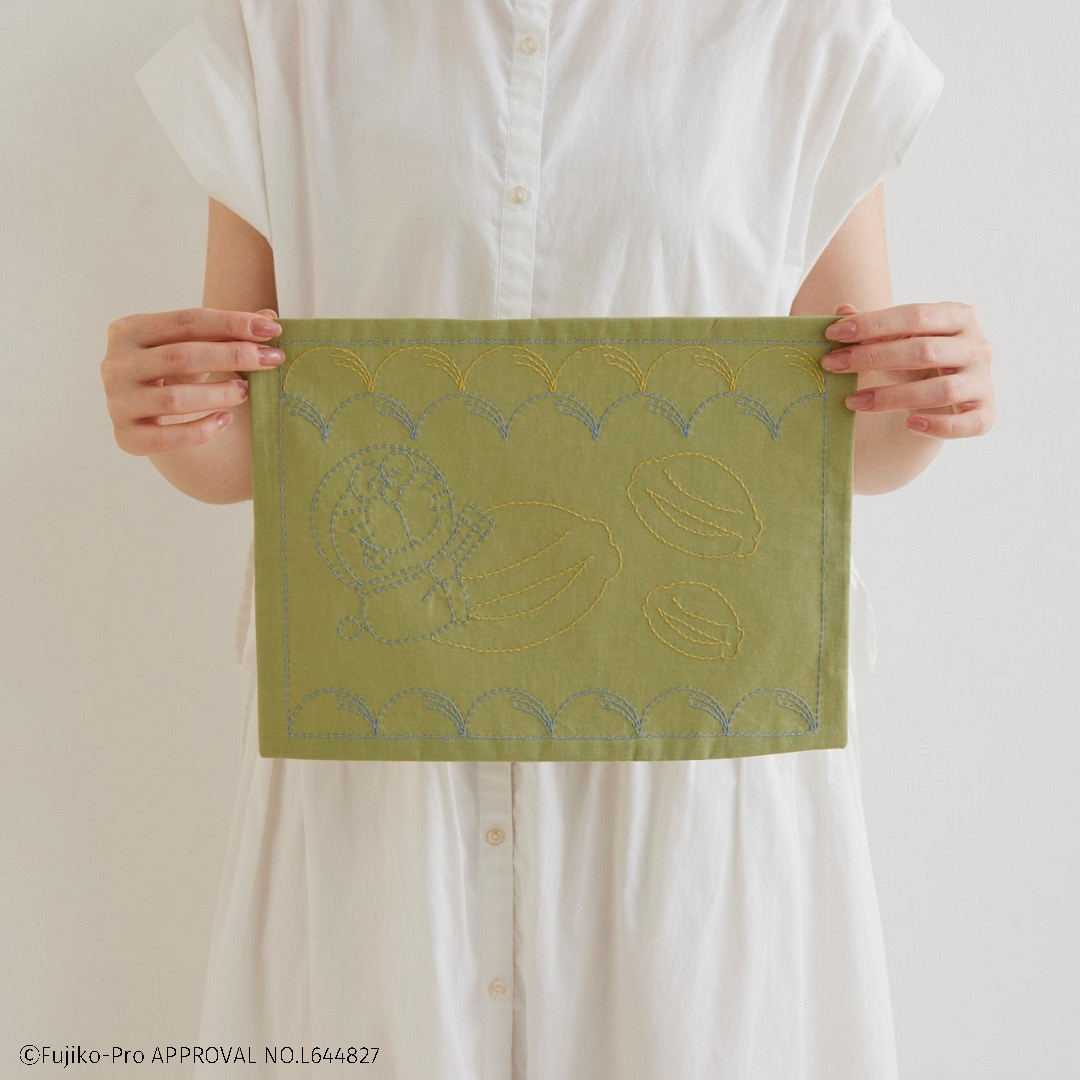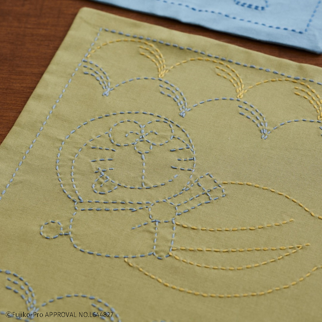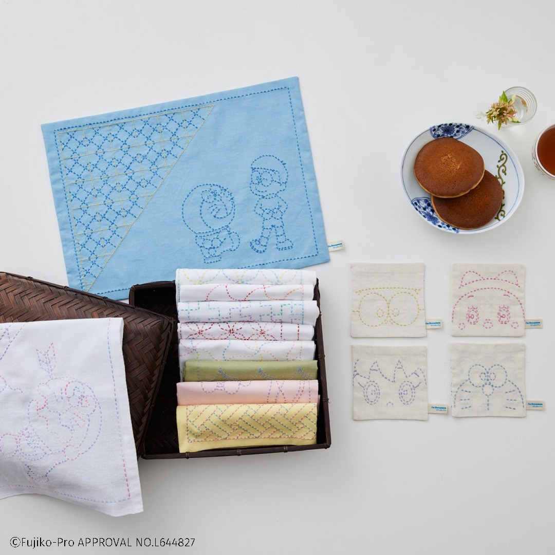 ドラえもんと日本の伝統柄「野分」が楽しめる刺し子キットです。 野に生える草が強い風に吹き分けられている日本の秋らしい風景が連想される野分。 ドラえもんの大好物のどら焼きを組み合わせて、ランチョンマットにぴったりな柄にしました。