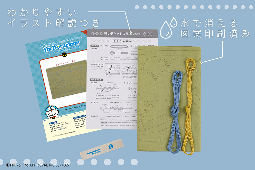 刺し子布には、水で消えるインクで図案が印刷されています。面倒な図案写しが不要で、しかも正確に刺せるので、初心者さんでも手間なくかわいく仕上がります。
