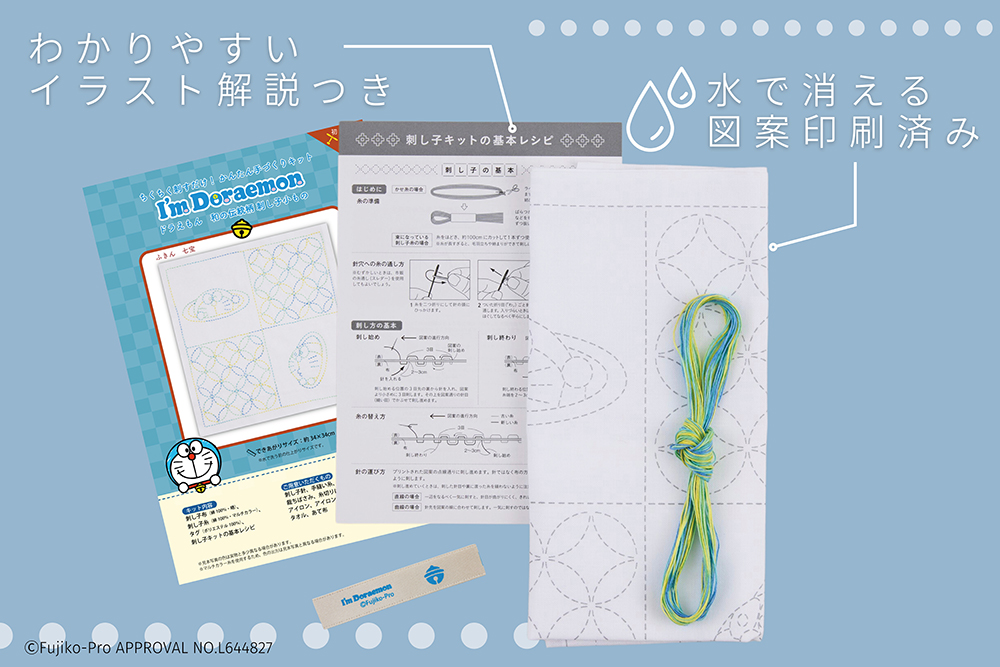 デザインいろいろ、ドラえもんと和の伝統柄の刺し子キット