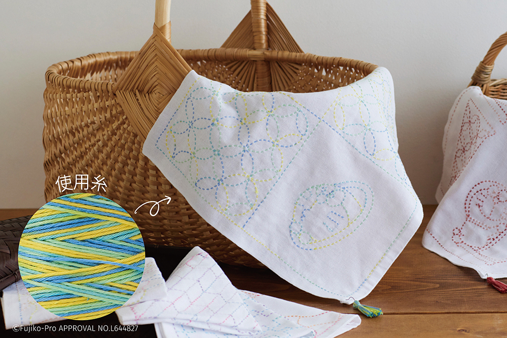 シンプルな白の晒し生地に映える、マルチカラーの刺し子糸を使用しています。水色・イエロー・グリーンなどきれいな色がかわるがわる布に浮かび上がり、刺している時間も癒されます。