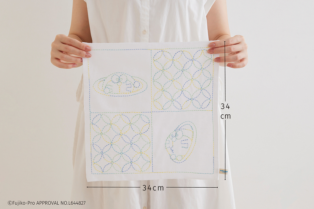 ドラえもんと日本の伝統柄「七宝」が楽しめる刺し子キットです。 「七宝」には連鎖し四方に広がる様子から、円満、ご縁などの願いが込められています。 壁を通り抜けられるドラえもんのひみつ道具「通りぬけフープ」。 通りぬけフープからひょっこり顔をのぞかせるドラえもんと組み合わせて、かわいいふきんにしました。