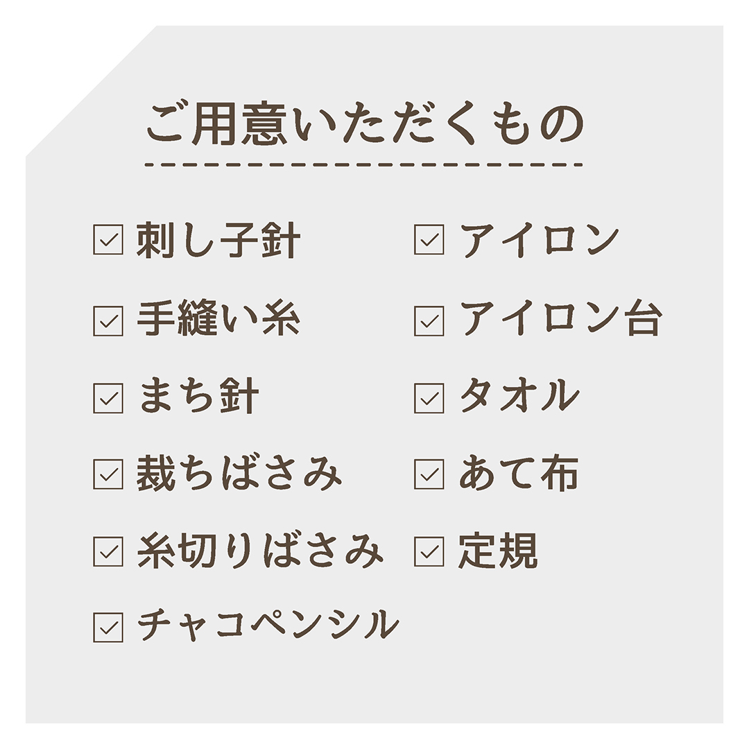 刺し子針、手縫い糸、まち針、裁ちばさみ、糸切りばさみ、チャコペンシル、アイロン、アイロン台、タオル、あて布、定規