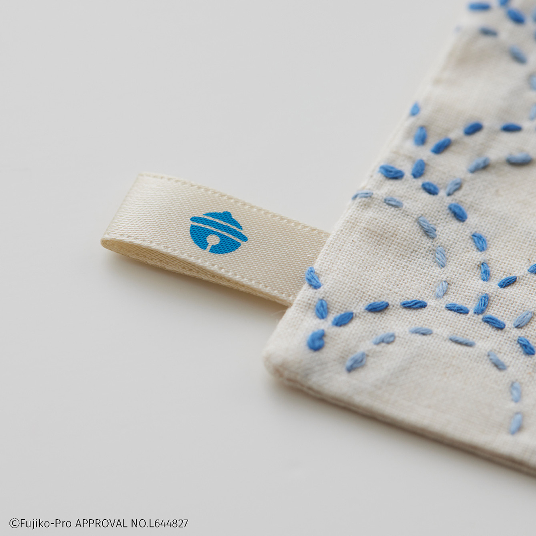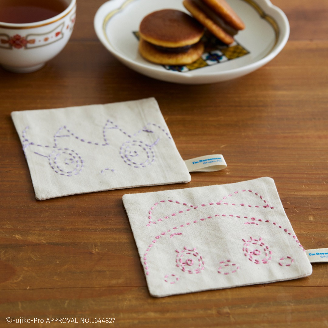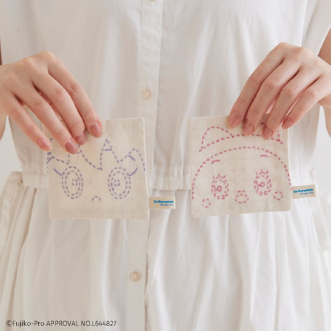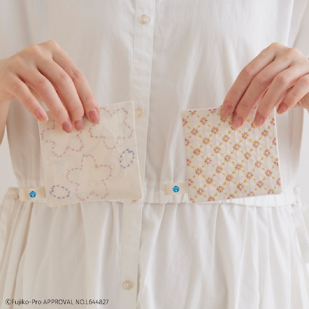 ドラミちゃん、しずかちゃんと日本の伝統柄「花格子」と「桜」が楽しめる刺し子キットです。 かわいらしいお花モチーフとドラミちゃんとしずかちゃんの顔を組み合わせてコースターにしました。