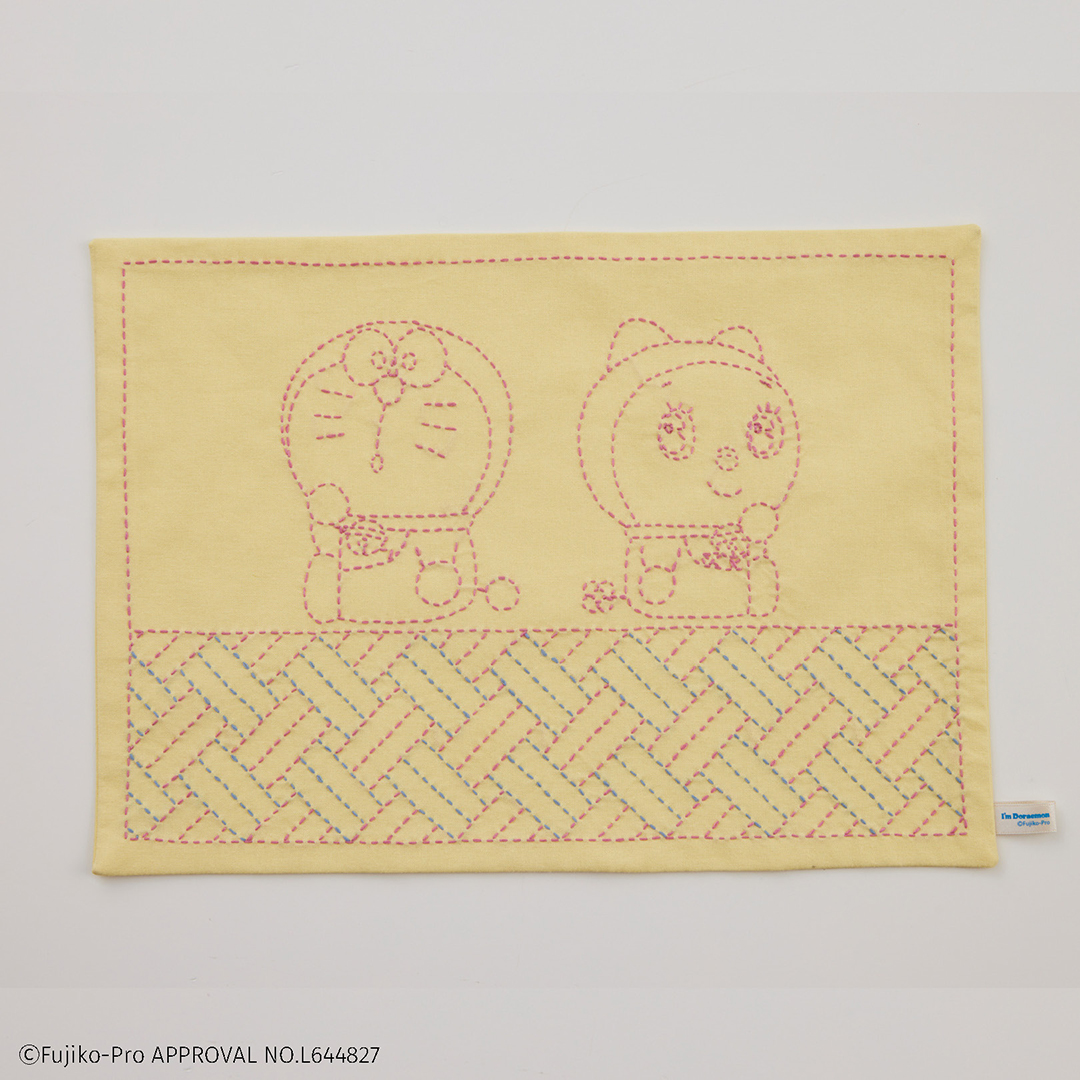 ドラえもん、ドラミちゃんと日本の伝統柄「網代」が楽しめる刺し子キットです。 魚を捕らえるために、竹などを網状に編まれた仕掛けが由来の「網代」。 網の代わりに使用されていたことから「網代」といわれ、大漁の願いがこめられた縁起のよい文様です。 同じポーズをしたドラえもんとドラミちゃんを組み合わせました。
