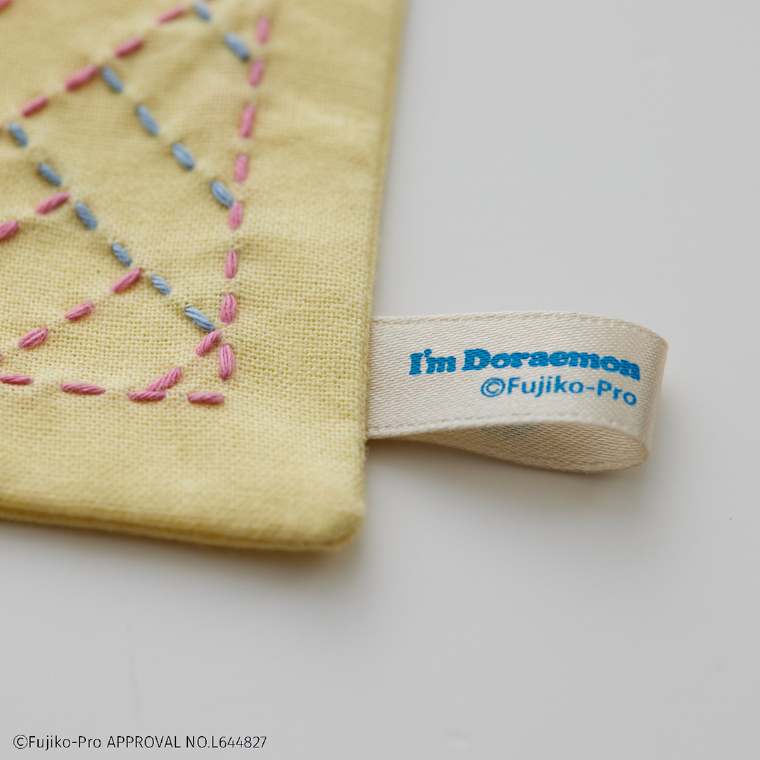 タグには「I’m Doraemon」のロゴと、ドラえもんらしい鈴のイラストをあしらっています。二つ折りにして縫い込めば、飾りとしてもフックにかける際のループとしても使えます。