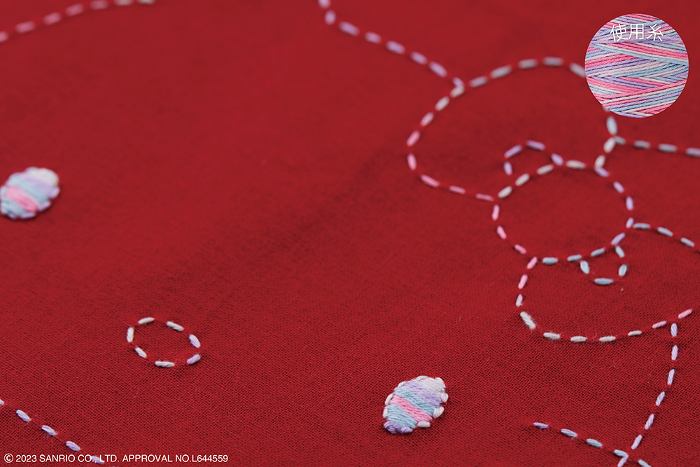 明るく華やかなカラー布と、刺し子糸の色の組み合わせも魅力のひとつ。大人でも使いやすい色調なので、身の回りのポイントカラーとしてお持ちいただくのもおすすめです。布に合わせた刺し子糸の配色で、かわいいキャラクターが浮かび上がり、刺している時間も癒されます。