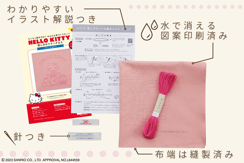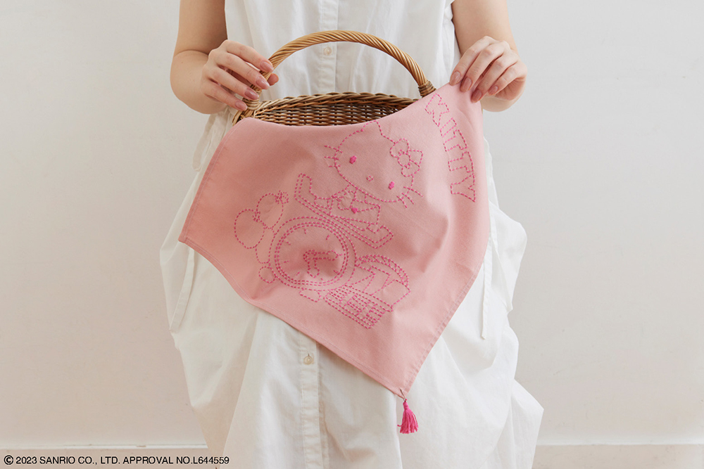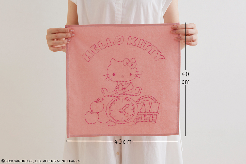 70年代のレトロなキティが魅力的な刺し子のキット。はかりの上に乗ったキティやリンゴ、手紙、バスケットなど、どこか懐かしくて、キュンとするようなかわいらしいモチーフがたくさん。ちくちく刺すのが楽しくなるデザインになっています。ピンクの布に、ピンクの刺し子糸の組み合わせで、デザインのかわいらしさをより引き立てます。