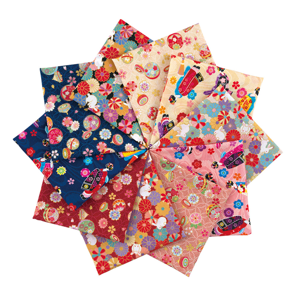 独楽や手まり、うさぎ、舞妓さんなどをモチーフにしたカットクロスのセット。金ラメを施したプリントもあり煌びやかです。小物作りなどにおすすめ。