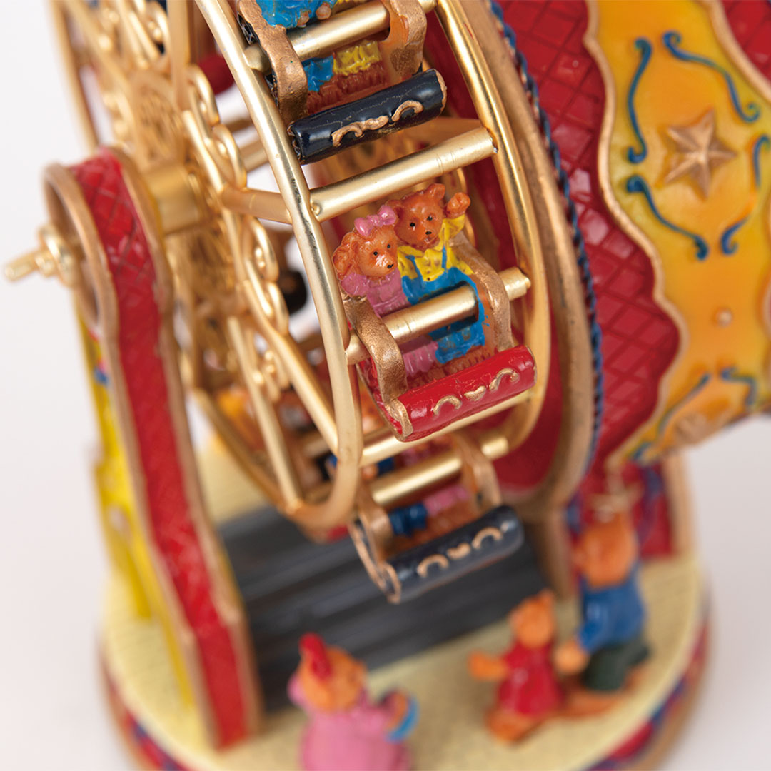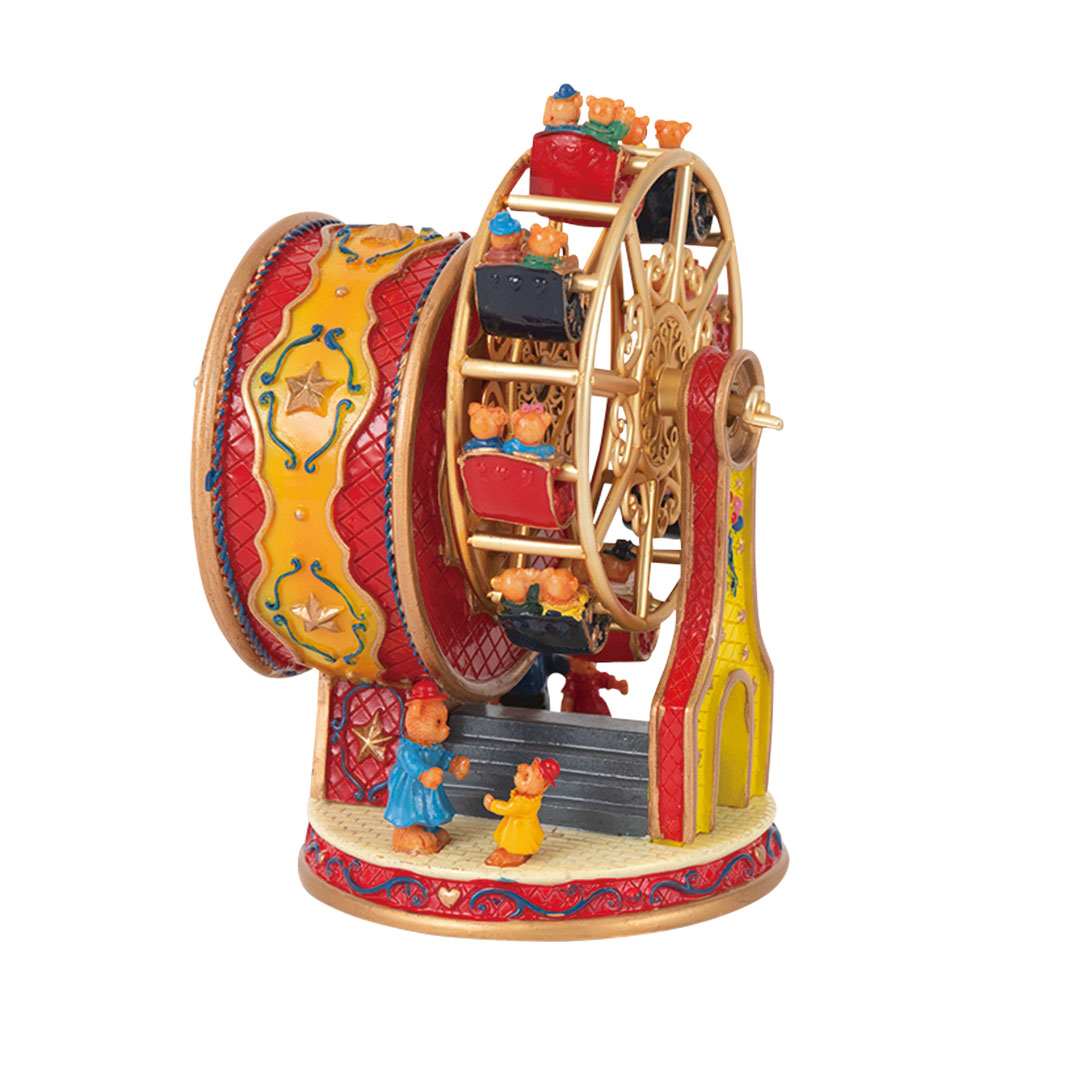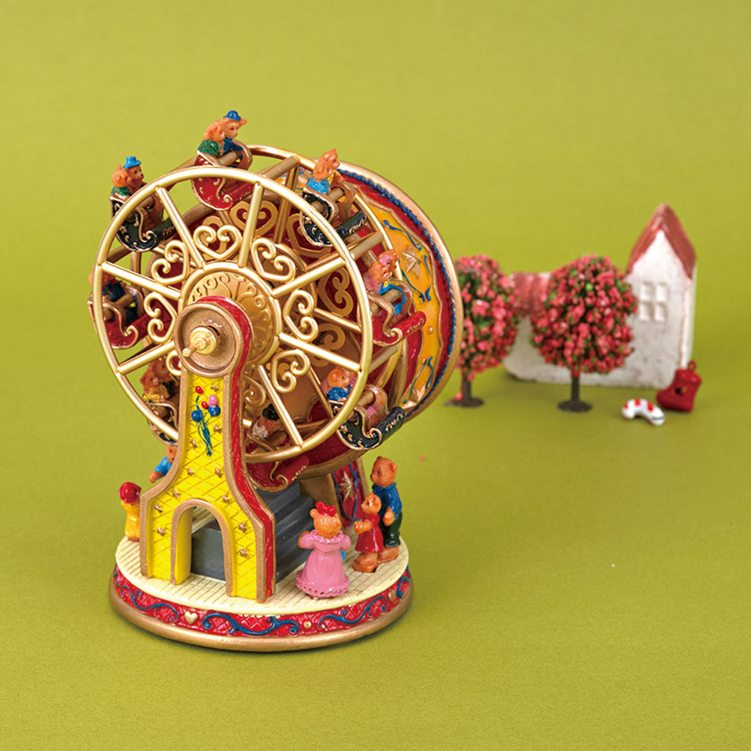 観覧車に乗ったテディベアたちが楽しく遊ぶ、手巻き式のオルゴール。流れる音楽「Toyland」に合わせて観覧車も回ります。