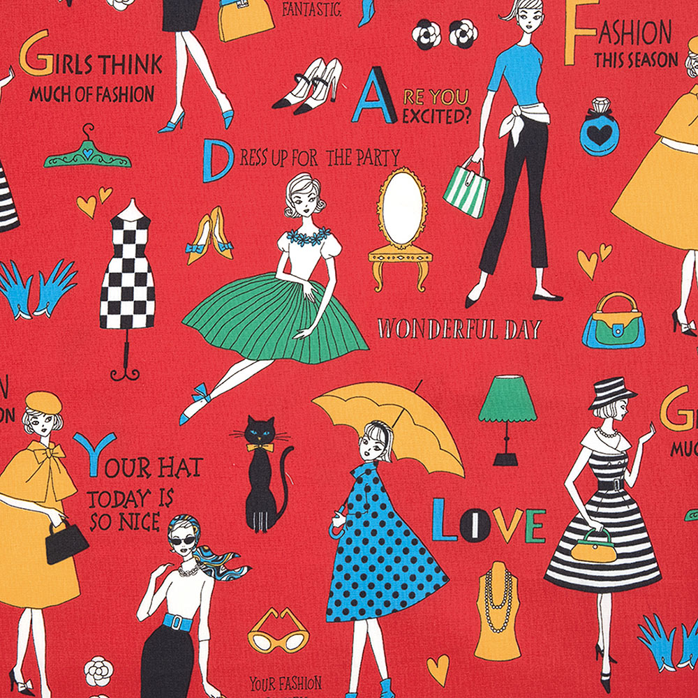 レトロスタイルのおしゃれな女性とファッションアイテムを描いたプリント。赤字に、カラフルな色使いがPOPな印象です。