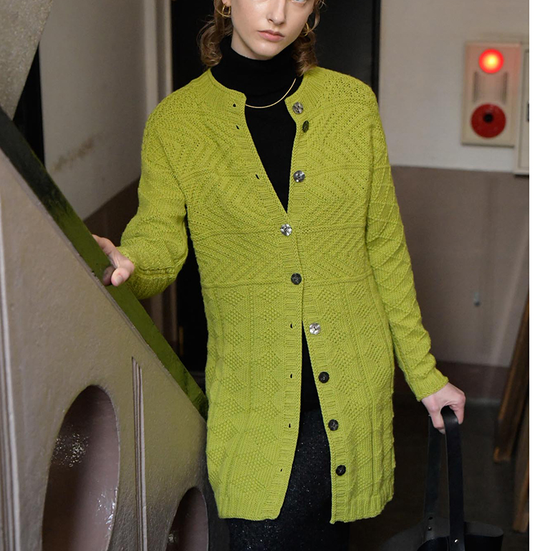 たっぷりしたロングカーディガンはハッとするようなライムカラーで印象的に。大きなジグザク模様と小さなダイヤモンド、格子柄に市松、袖にはケーブル、脇下には三角まちと、さりげなく変化をつけて編むときも飽きさせません。