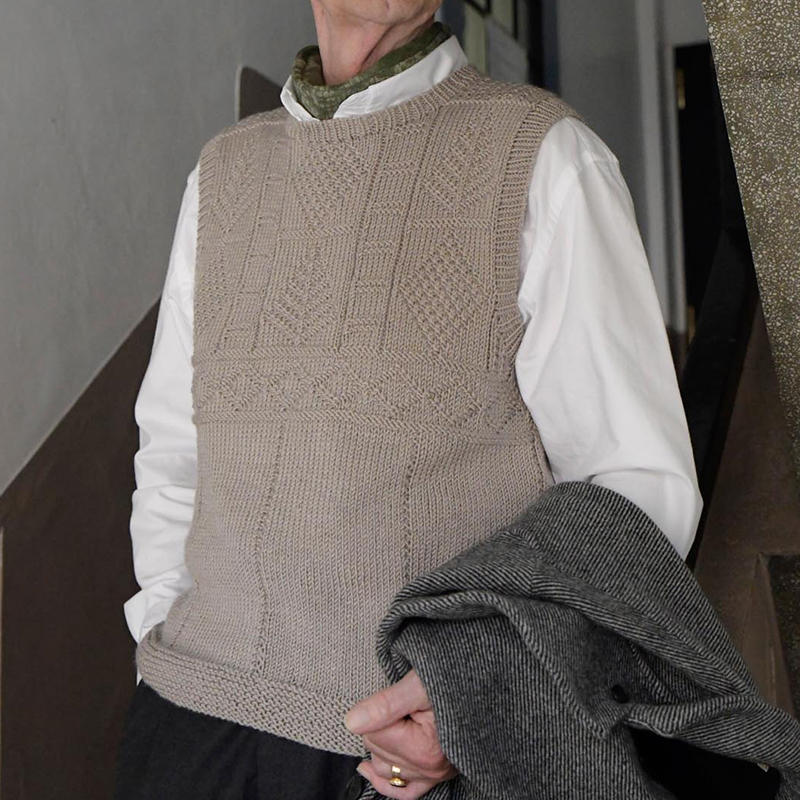 究極のベーシックとも言えるベストは、スタイリング次第で着回しやすい1枚。ドレスアップもカジュアルダウンもお任せあれ。肩以外にとじはぎのないベストは気負わず編めるのが嬉しいですね。愛嬌のあるお揃いの帽子もぜひどうぞ。