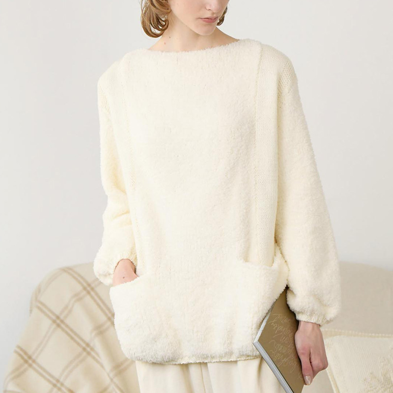 生まれたての白うさぎみたいな真っ白プルオーバー。後ろ身頃と前脇部分はストレートヤーンにして続けて編むことで、ふわもこパーツとの対比が粋なアクセントになっています。仕立ても楽になって一石二鳥!