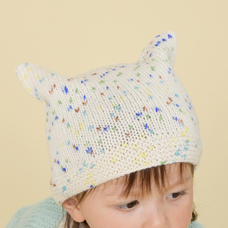 メリヤス編みの帽子は、ぐるぐると輪に編んでトップをはいだだけのシンプル仕様。