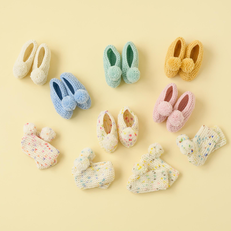 シューズはチャチャっと20段編んで、半分に折ったら3カ所とじてできあがり! 毎段表目を編むだけなので、初心者ママにもおすすめです。可愛いポンポンで飾りましょう。